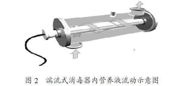 針對(duì)上述問(wèn)題,自行設(shè)計(jì)了一種新型的紫外線(xiàn)消毒器[17]:在消毒腔體內(nèi)安裝螺旋形導(dǎo)流片,使?fàn)I養(yǎng)液以湍流形式流動(dòng)(圖2),即讓沿不銹鋼腔體內(nèi)壁流動(dòng)的營(yíng)養(yǎng)液也有一部分時(shí)間是在石英套管附近流動(dòng)。營(yíng)養(yǎng)液在距離紫外燈管較近或較遠(yuǎn)的兩個(gè)區(qū)域停留的時(shí)間接近,從而解決了因一部分營(yíng)養(yǎng)液滅菌不徹底而影響整體滅菌效果的問(wèn)題。