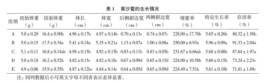 試驗(yàn)期間,每隔3 d 從池中取樣測量水質(zhì),測定其溶解氧、氨氮含量、亞硝酸鹽含量,試驗(yàn)周期為21 d。試驗(yàn)結(jié)束時(shí),統(tǒng)計(jì)各組黃沙鱉的存活數(shù)量。并隨機(jī)從水池中取出10 只黃沙鱉,測量其體重、體長、體寬、裙邊寬度,其中后側(cè)裙邊寬度為背甲 很長線上背甲邊到裙邊邊緣的距離;兩側(cè)裙邊寬度為背甲 很寬線上背甲邊到裙邊邊緣的距離。