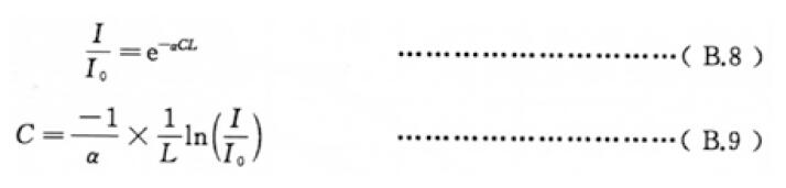 臭氧對254 nm 波長的紫外光有特征吸收。臭氧化氣樣品和參比氣體( 不含臭氧的空氣或氧氣)分別以恒定的流速進(jìn)入儀器的吸收池,參比氣通過吸收池時,被光檢測器檢測的光強(qiáng)為I0,樣品氣通過吸收池時被檢測器檢測的光強(qiáng)為I 0。I / I 0 為透光率。儀器的微處理系統(tǒng)根據(jù)朗伯- 比爾定律計(jì)算出臭氧濃度,這些量之間的關(guān)系表示為式(B.8) 或式(B.9):